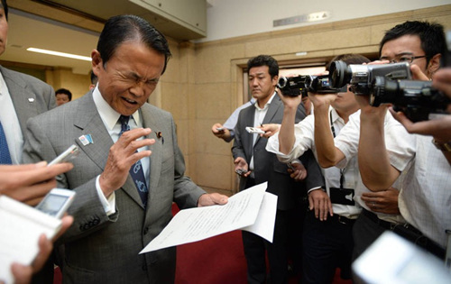 日本副首相麻生太郎收回以纳粹政府为例的发言(8月1日摄于日本财务省)