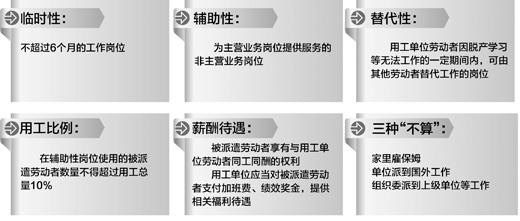 此次,征求意见稿提出,临时性工作岗位是指存续时间不超过6个月的工作岗位。辅助性工作岗位是指为主营业务岗位提供服务的非主营业务岗位。用工单位的辅助性岗位由用工单位根据所处行业和业务特点,提出拟使用劳务派遣用工的辅助性岗位列表,经与工会或职工代表大会共同协商确定,并在用工单位内公示,接受监督。替代性工作岗位是指用工单位的劳动者因脱产学习、休假等原因无法工作的一定期间内,可以由其他劳动者替代工作的岗位。