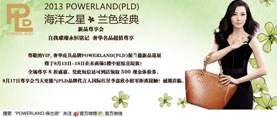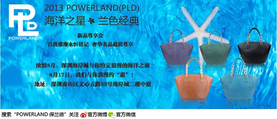 POWERLAND ( PLD )保兰德将把深圳海岸城中庭幻化成海底梦境,在轻盈飘逸、优雅灵动的尊贵时尚秀中,将 2013 全新海洋系列产品惊艳亮相,与您一起感受时尚品牌皮具的艺术风采。 8 月 13 日至 8 月 18 日,正价产品尊享 8 折优惠!受邀的 VIP 及嘉宾将获得价值 10000 元的尊贵体验券!顾客凭借官方活动微信及短信可免费获得价值 500 元的尊贵体验券!