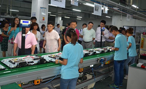 冠捷科技(青岛)有限公司为冠捷集团和华通集团共同出资建设的显示器设备生产企业,厂房采用了绿色环保的设计理念,为二星级绿色建筑,整洁开阔的工作环境和井然有序的生产流程给人耳目一新的感受。刘甘霖副书记、范建军副总经理率队首先参观了液晶电视的装配车间,他们仔细观摩了工人在流水线上的组装过程,听取了冠捷科技相关人员对工厂管理以及销售情况的介绍。