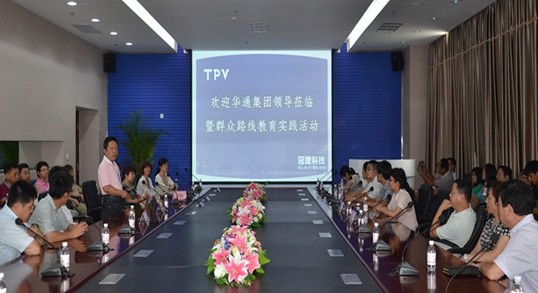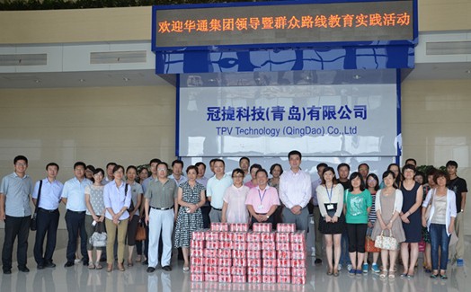 根据青岛市委党的群众路线教育实践活动领导小组《关于深化党的群众路线教育开展“接地气、连民心”实践活动的实施意见》文件精神,结合华通集团教育实践活动安排, 8月12日,在集团党委副书记、党的群众路线实践教育活动领导小组办公室主任刘甘霖、副总经理范建军的带领下,集团本部及所属益青、机械公司的党员干部来到集团参股企业-冠捷科技(青岛)有限公司,参观了企业生产车间,与企业领导班子进行了座谈,并为一线职工送去防暑降温饮料。