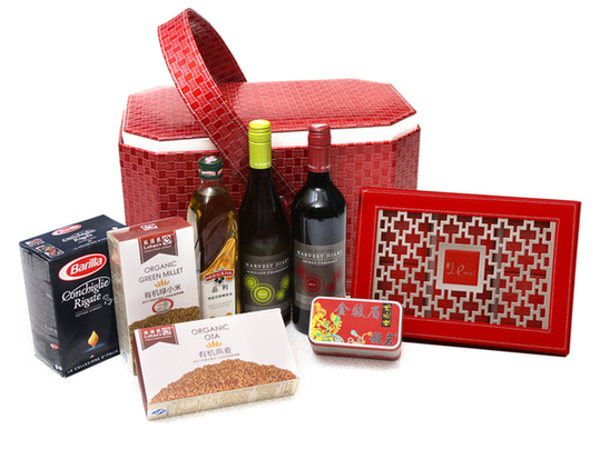 包含月饼礼盒一盒,德保利收获珍藏红葡萄酒、德保利收获珍藏白葡萄酒各一瓶,品利特技初榨橄榄油一瓶,乐活氏有机燕麦、乐活氏有机绿小米、百味来意大利面、金骏眉茶叶各一盒