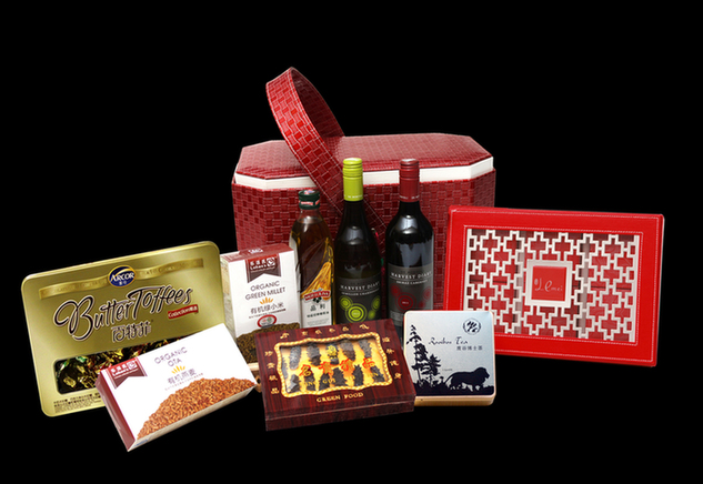 包含月饼礼盒一盒,德保利收获珍藏红葡萄酒、德保利收获珍藏白葡萄酒各一瓶,品利特技初榨橄榄油一瓶,乐活氏有机燕麦、乐活氏有机绿小米、海参礼盒、百特菲阿根廷太妃糖、鹰谷博士茶各一盒。