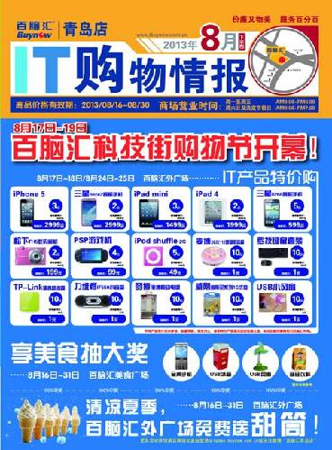 从8月份开始,青岛百脑汇等各大商场一年一度的年中打折促销高潮随之而来, 8月17日,百脑汇科技街购物节盛大开幕!如果想要淘便宜,现在是出手的好时机,每周末均有疯狂秒杀精品IT,ipad mini 1499元,iphone5 2999元,大屏智能手机三星note2 2999元,ipad4 1999元,ipod shuffle 49元……购物满一百,中奖百分百,满一千送旺旺清凉饮料一箱,更多免费甜筒无限大放送!