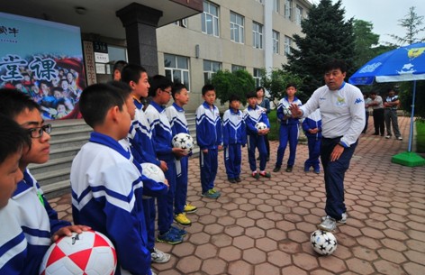 (迟尚斌“回家乡上堂课”传授孩子们足球技巧)