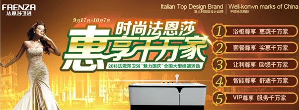 为回馈14来年消费者的一贯支持,法恩莎卫浴重磅推出了“时尚法恩莎 惠享千万家”系列活动。此次“魅力国庆”活动从9月17日-10月7日,历经20天,法恩莎卫浴推出了众多的品类单品与组合套装,并推出“全额付款,满5000元直降500元”、 “全额付款,满10000元直降1200元”、“全额付款,满20000元直降2500元”等的真金白银让利活动,让利给广大消费者。