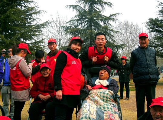 林潇逸和志愿者陪敬老院的老人在公园散步
