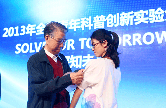 中国工程院院士陈肇元先生代表大赛组织者向清华大学学生代表授予象征科学梦想传承的徽章,鼓励她坚持科学创新。