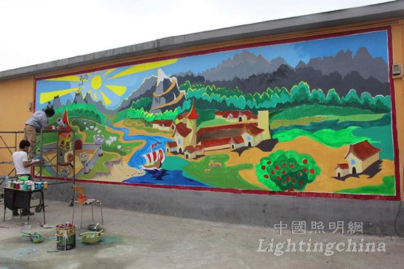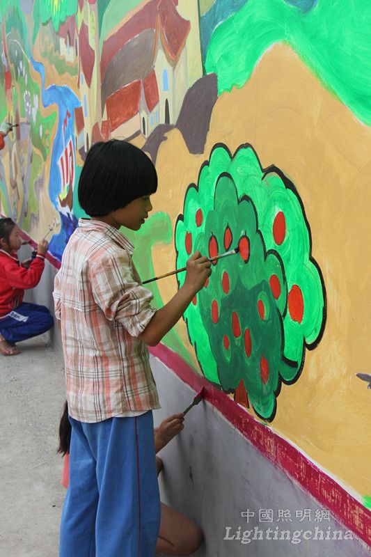北京清红蓝小学位于北京市顺义区,是一所贫困打工子弟小学,也是集团今年新确立的公益对象。上半年集团已为学校捐助书籍、校服并修葺校舍,为了进一步美化校园环境,近日还为部分校舍墙体绘制壁画。壁画长9米高3米,绘有山水房屋等卡通图案,壁画绘制过程中,很多学生参与进行描边上色等工作,让孩子们通过亲自动手体验美化校园,增添了对校园的主人公精神。