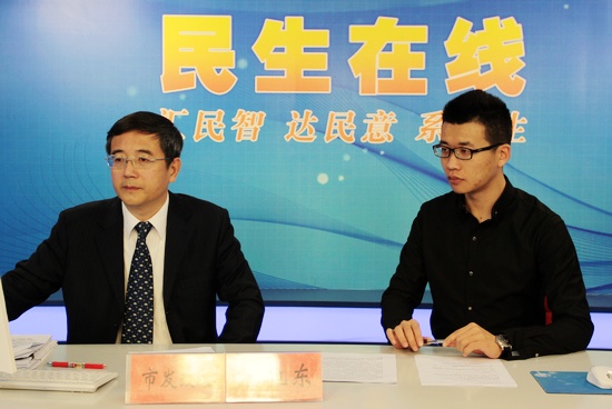 青岛市发展和改革委员会副主任张旭东(左一)与网民交流 (周琦 摄)