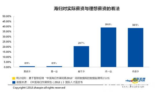 但是,海归的含金量也在缩水,调查也显示,77.5%的海归都表示实际薪资比理想薪资低,仅1.8%的海归表示实际薪资高于自己的期望值。《中国海归发展报告(2013)》国际人才蓝皮书调查也发现海归收回留学成本时间较长。48.8%的就业型海归需要花5年时间或者更长的时间收回留学成本,11.1%的海归认为需要花费4年时间收回留学成本,只有11.1%的海归认为1年即可收回成本。