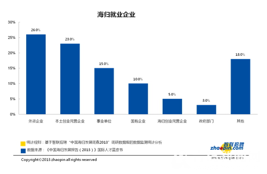 三、海归就业首选“外企” 看重薪酬、福利与职业发展智联招聘《中国海归发展报告(2013)》国际人才蓝皮书调查分析表明,外资企业是海归回国就业的首选,超过1/4的海归选择进入外企就业。对海归而言,由于教育环境、国外的工作环境与外企的工作环境更接近,所以他们更青睐管理制度更加完善的外企。据调查,薪酬、职业发展和福利已成为影响高端人才流动的前三大因素,外资企业的薪酬、职业发展空间和福利等三部分综合来说较高,这也是海归选择外资企业的原因。按照人数比例,其他吸纳海归就业较多的单位类型包括本土创办的民营企业(22.8%)、事业单位(15.1%)、国有企业(9.9%)、海归创办的民营企业(5.0%)及政府部门(3.0%)。