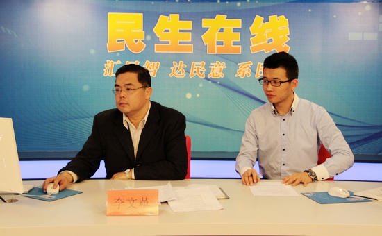 青岛市文化广电新闻出版局副局长李文革(左一)与网民交流 (周琦 摄)