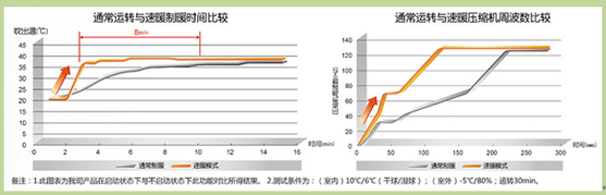 松下空调速暖技术 [ 制暖时间及压缩机周波数 ] 对比示意图