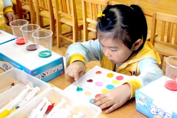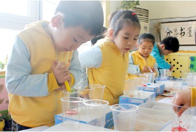 “看!我的橙子有颜色啦!大家想知道这是怎么回事吗?那就让我们自己动动手实验一下吧!”在老师的号召下,小朋友们来到实验桌旁,认认真真的拿起针管,很快配出了所有的颜色。
