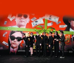 《私人订制》的主创昨日到场为新片造势,左起:王中磊、李小璐、冯小刚、郑恺、胡海泉、白百何以及她的老公陈羽凡。