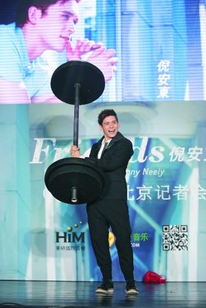 减肥成功的倪安东在发布会上卖萌表演“拳击”和“举重”动作。