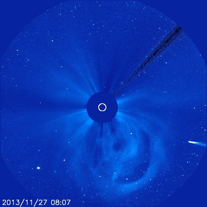 然而随后最新的SOHO LASCO C2图像上却可以隐约看出这颗彗星似乎经历了浴火重生。美国宇航局官方网站截至目前对此尚未发布确定结论,但表示ISON彗星“很可能已经解体”。这样跌宕起伏的情节和出人意料的进展也让这颗彗星越发让人感到难以捉摸。“太阳与日光层探测器”(SOHO)记录下了ISON彗星掠日全程。