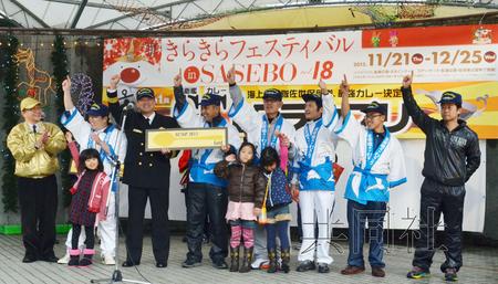 12月1日,长崎县佐世保市举办护卫舰咖喱大赛,夺得首届冠军的“泽雾”号队员们欣喜不已。