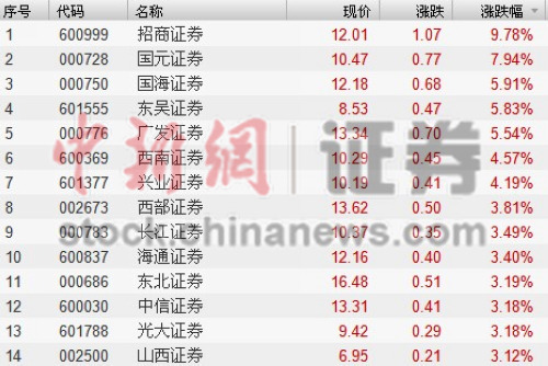 在全线飘绿的行情中,金融板块逆市上涨。据中信行业分类,非银行金融板块上涨2.78%,领涨两市。非银行金融板块的中18只券商股中,除停牌的方正证券,宏源证券外,其余全线上涨,招商证券涨幅更是高达9.78%。