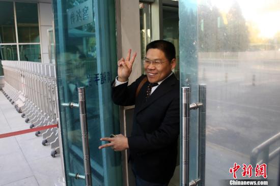 11月19日,受害人律师田参军进入法院前比出胜利手势。当日,李某某等涉嫌轮奸案在北京市第一中级人民法院开庭审理。中新社发 韩海丹 摄