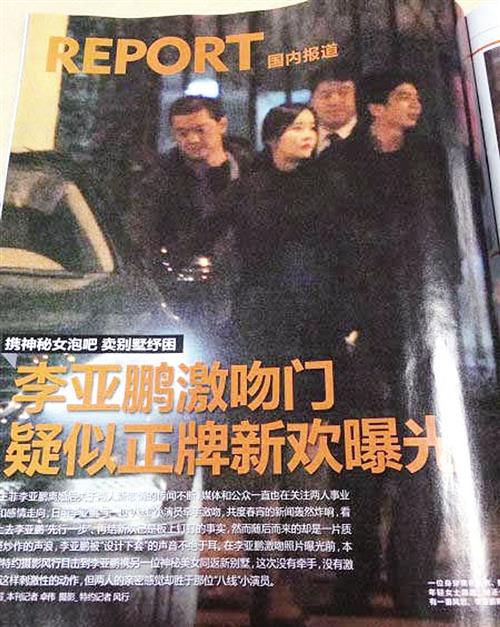 近日,有记者深夜在北京工体院内的一家高档酒吧门前撞见了李亚鹏平时乘坐的豪华轿车。凌晨1点左右李亚鹏和一大群人蜂拥着走到停车场,他们高谈阔论,气氛热烈。在李亚鹏的身前是一位身穿黑色大衣、扎着马尾辫的年轻女士,她和李亚鹏的手里都夹着香烟。黑衣女士看气质举止也不像是娱乐圈人士,更像是一位商场“女杰”。当天与她和李亚鹏一起泡吧的那几位朋友也都好像是商场中人,李亚鹏带着那位黑衣女士会友言商,似乎证明李亚鹏对两人的关系在朋友圈中也不避讳。