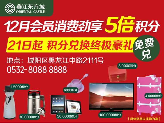 12月21日9:00至31日21:00,会员凭积分可至1楼客服中心兑换精美礼品。47寸液晶电视、IPAD5、联想超极本、三星手机、豆浆机、移动充电器、复古旅行箱、品质首饰盒等您来换哦。小积分大派“兑”,惊喜豪礼换不停,全年仅此1次!积分查询电话80888888