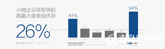 从企业的规模来看,呈现了两极分化,一万人以上的企业职位需求增幅达到了94%。另外一个方面令人觉得非常欣喜,也是非常有意思的是20人以下的小微企业增长达到了61%。政府宏观调控对于小微企业的支持已经开始有所体现。