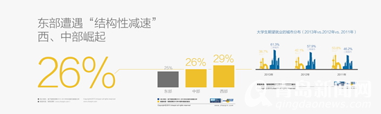 从地域上讲二三线市场不断崛起,东部的经济调整并没有那么快,但是中、西部增长的非常快,跑赢大盘增幅。东部沿海城市的职位增长率相对缓慢,从GDP的角度,2013年内陆城市中部、西部经济扩张速度也是比较快的,与劳动力市场数据完全吻合。中部、西部的扩张不但带来了区域增长,另外一个非常好的现象,大学生期望的就业城市分布,越来越多的大学生愿意主动离开北上广进入二三线城市就业,这与70、80后的被动离开是不同的。2011年愿意到二三线城市的46%,现在达到61%,从这一点微观数据可以看到经济发展的新趋势:中西部崛起,人才流动就是这个趋势的最好佐证。