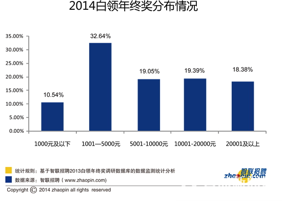 究竟白领在2013年拿到了多少年终奖?智联招聘此次调研数据显示,超一成白领年终奖不到1000元,多数白领年终奖集中在1000-5000元之间,占比达32.64%。