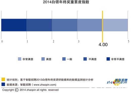 智联招聘此次调查显示,年终奖在白领衡量一份工作薪酬福利水平中的重要度达到4.00,年终奖对白领来说十分重要。