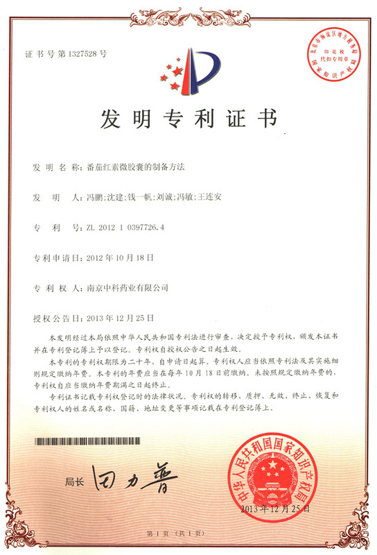 2013年12月,南京中科集团研发生产的中科番茄红素微胶囊的制备方法取得国家发明专利,专利号:ZL201210397726.4,证书号,第1327528号,此专利也同步申请了国际PCT,已进入国际阶段。