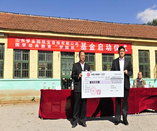 梦金园坚持“追求卓越、奉献社会”的价值理念,创造经济价值,回馈社会,热心慈善,关心教育。2010年成立慈善基金,至今已经累计投入2000多万元。2011年成立忠善助学基金,三年来已经累计发放助学金69万(2011年捐助23万,2012年捐助28万,2013年底捐助18万),极大程度的为当地贫困学生就学解决了难题,也为昌乐当地四所中小学的教学设施的提高做出了贡献。