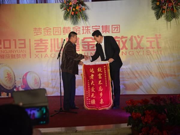 国内著名黄金首饰企业梦金园为倡导爱老、敬老、助老的良好风尚,弘扬中华民族优秀传统文化,推进员工道德建设,让每位员工学会感恩父母、感恩社会,树立新时期孝道理念,2013年始设立孝心基金,孝心基金由两部分组成,一分部是公司为每位员工的父母每月出100元,另一部分由员工每月出100元,年底将基金发放到员工父母手中。元月12日(腊月十二),梦金园孝心基金发放仪式在昌乐昌城大酒店盛大举行,1000余名员工及父母代表参加,现场发放孝心基金300多万元。