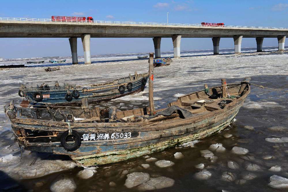 胶州湾的部分渔船被海冰冻住(2月10日摄)。