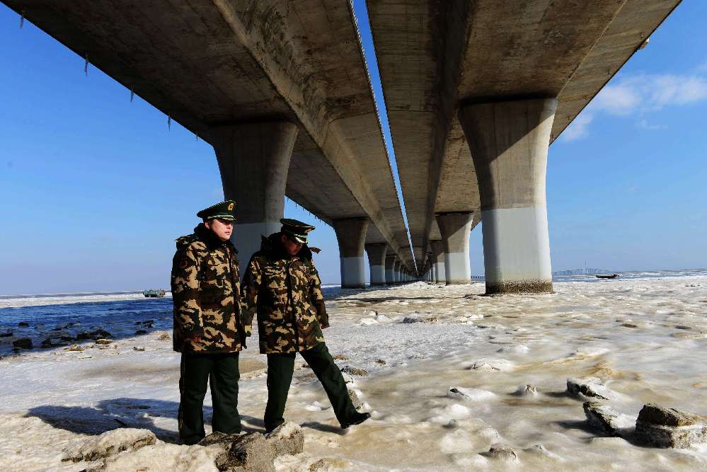 近日,受连续低温天气影响,胶州湾西北湾畔出现大片海冰,部分渔船被冻在浅滩上。据悉,这是2013年入冬以来胶州湾海域首次出现大面积海冰。新华社发(俞方平 摄)