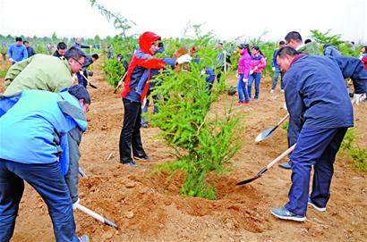 昨天是我国第36个植树节,我市共有45.63万人参加了当天的义务植树劳动,拉开了全年造林生产的序幕。图为红岛经济区组织近千人赴河套万亩生态间隔林场参加义务植树活动。