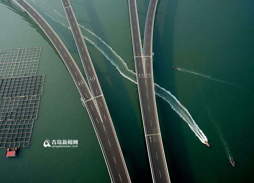有人说,大桥是一条“玉带”,为红瓦、绿树、碧海、蓝天的青岛增添了美誉。但是,很少有人尝试从高空俯瞰,感受这座巨型钢筋混凝土之躯磅礴的生命力。犹如长龙横卧的大桥线条硬朗,烟波浩渺的大海画面宁静唯美,这种刚柔并济的视觉冲击,就是青岛航拍达人张广浩运用精湛的航拍技术,完美打造的“上帝视角”。(记者 谢小真 摄影 张广浩)