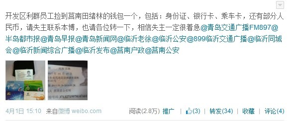 青岛新闻网4月3日讯 莒南小伙田绪龙在开发区游玩,结果把钱包不小心丢了,小田非常着急;而钱包恰巧被青岛长江利群购物广场的员工薛彩霞捡到,而她也非常着急,无法找到钱包的主人。在本网记者发博网上寻找时,经过两地互动,不到一天时间,钱包迅速回到主人身边。