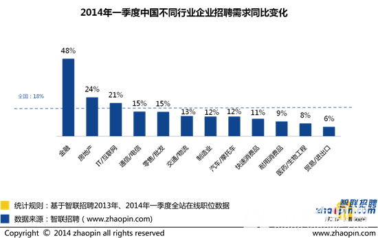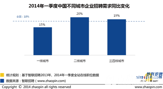 2014年一季度,智联招聘在线职位发布数同比2013年增长18%。受益于政策支持和全球需求的部分改善,中国经济出现稳中有升迹象。从国家统计局发布的制造业采购经理人指数 (PMI) 来看,1月份50.5,2月份为50.2,虽较2013年底略显低迷,但仍处于50这一荣枯分水岭的上限,表明制造业活动正在扩张。加之近期的一些利好消息,包括全国两会召开等,都给市场带来了利好的刺激。智联招聘基于全网的大数据,对各行业岗位需求进行全盘的分析,力图透过对行业需求的观察来印证中国劳动力市场与中国经济市场互相印证和影响的关系。作为正在快速发展的网络招聘行业,作为行业内首屈一指的智联招聘的庞大数据库将是最具参考价值劳动力市场大数据。
