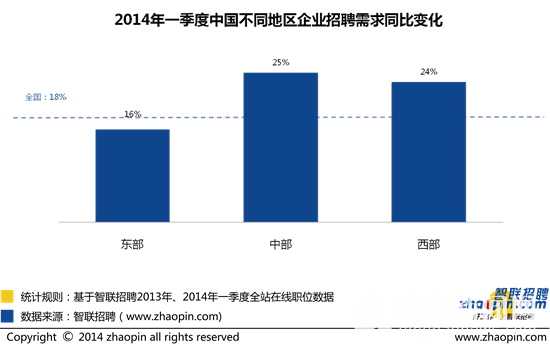 东部地区招聘需求增幅略低于全国平均水平,中部、西部高于全国平均水平。这也印证了国务院出台的《促进中部地区崛起规划》,中部地区成为中国政府经济发展的侧重点。智联招聘认为,众多企业顺应潮流加大中部地区投资力度,如汽车制造、电子产品代工、能源、材料、化工等企业驻扎中部地区,未来还将会带动其招聘需求大幅增加。