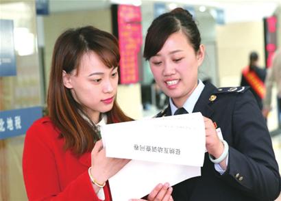 图为办税人员正在通过问卷调查的形式,征求纳税人对税务机关便民办税的意见建议。