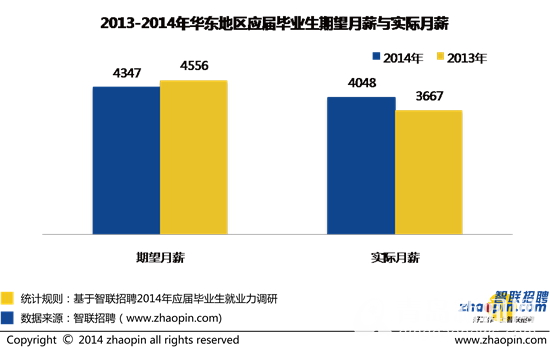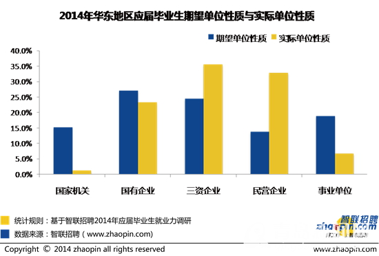2014年华东地区应届生期望就业地中,42.5%希望到北京、上海、广州就业,省会城市为49.8%,其他城市为7.7%。从本届应届生最终签约的城市来看,34.2%的应届生签约工作的工作地点在北京、上海、广州,低于期望值42.5%;实际签约省会城市的比例为53.4%,高于期望值49.8%;实际签约于其他城市的比例为12.3%,高于期望值7.7%。从这一对比可以看出,华东地区大学生对就业于北上广的期望并不是最高的,省会城市才是华东地区应届生毕业的首选。这与华东地区不同级别城市经济发展均较为良好,经济差距不大,因此应届生在选择就业地时不会出现扎堆一线城市的情况。