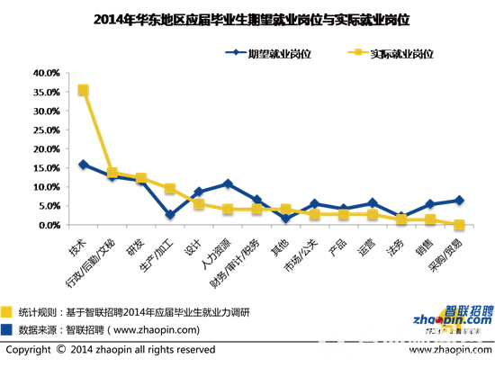 (5)期望就业岗位vs.实际就业岗位 • 技术类岗位列居大学生就业岗位之首。从华东地区应届毕业生期望从事的岗位来看,期望从事技术、行政/后勤/文秘、研发这三大岗位的大学生比例最高,这一现象与大学生中理工类学生占比大;行政/后勤/文秘类岗位对从业人员专业性要求不高有较大关系。从实际就业的岗位来看,技术类岗位的应届毕业生占比遥遥领先,远高于其后的行政/后勤/文秘、研发。签约技术类岗位的比例较高这一现象,一方面与理工类学生占比高有关,另一方面与理工类学生相比其他专业找工作较为容易,签约较早,因此占比较高也有一定关系。