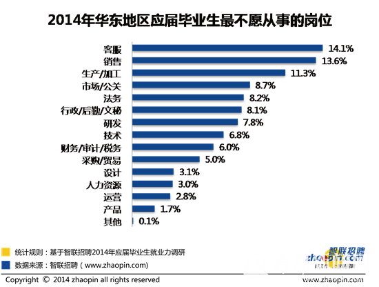从华东地区应届毕业生最不愿从事的岗位来看,客服、销售、生产/加工位居前三。客服类职位劳动强度大,报酬较低,对从业人员的专业性要求也不高,因此较难受大学毕业班青睐;销售类职位长期以来一直不受学生欢迎,而从职场现状来看,销售类职位是供应量最大且回报颇丰的岗位;生产/加工类职位也因与大学生较多从事办公室工作这一趋向不符,因此大学生较少愿意从事这一岗位。对于岗位选择来说,一方面要看是否大学生是否喜欢和擅长从事这一岗位,另一方面也需要大学生对职场实际状况有更多的了解。很多大学生在择业前并不了解他们即将申请的职位究竟是什么样的工作内容和工作状态,他们往往在不了解岗位的情况下,来决定自己的第一份工作。学校需引导学生通过各种途径了解职场上各个岗位的真实情况,消解刻板印象,帮助大学生找到适合的岗位。