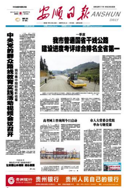 5月4日,省公路局对全省2014年一季度普通国省干线公路建设进度督查考核情况进行了通报,安顺市在地区排名、地州市交通运输局排名中双摘“桂冠”,综合排名全省第一。