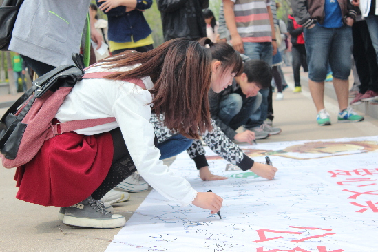 活动当天,春晖志愿服务队在学校玉兰西门、荟萃西门、唐岛湾东门三地同时进行了公益义卖与环保宣传。现场吸引了众多师生前来参与,他们纷纷在横幅上签上了自己的名字表达决心。
