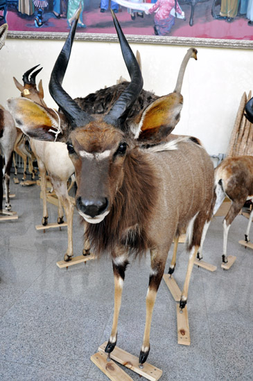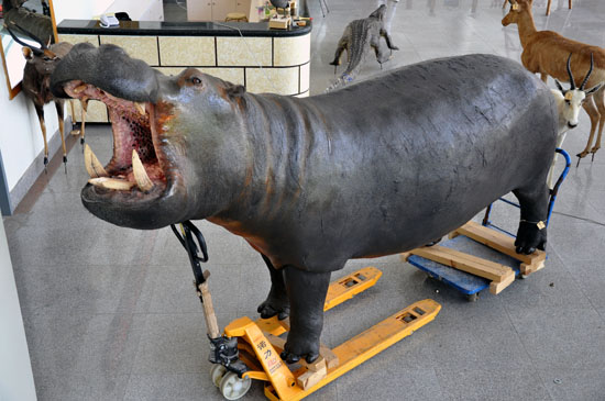 据博物馆管理员于周超老师介绍,这次运抵青岛滨海学院艺术馆的全是非洲标本,大型标本偏多,达30余件;新增豚尾狒狒、蜜獾、非洲白背兀鹫、珍珠鸡、褐鬣狗、白尾獴等多个物种标本。和原来类似的标本也绝非简单重复:比如,新进的河马、尼罗鳄为成年动物标本,相较原来标本体型更大,造型更为威猛;新进鸵鸟为雌性,和原来雄性标本自然搭配,在非洲生态环境布局中更能体现其习性特点;其他大型羚角类标本,虽外形相似,但均为羚角类家族不同分支,大大丰富了羚角类动物标本品种。
