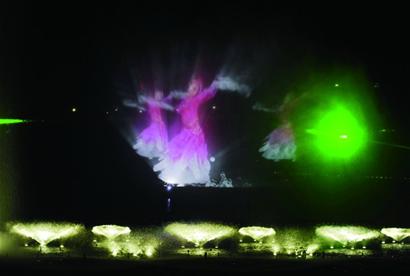 紧接着在下一个水舞秀节目中,舒缓的音乐引来一名身着彩衣的女子,美妙的身姿伴随着宽大的衣服、长长的水袖舞动着,“人怎么会在空中飘浮?不可能有舞台呀,就算放电影,也得有个屏幕撑着吧!”有幸观赏夜场水舞秀的工作人员、游客简直惊呆了。世园会工作人员则解开了谜底,原来天水之中有许多喷头,其中一部分喷出精细的水雾,弥漫在半空中,远处的投影仪将视频投放到水幕上,水幕成了视频播放的屏幕。