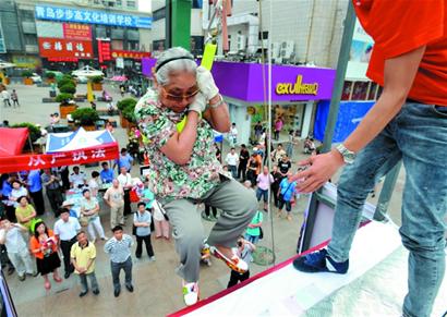 昨日,市北区安监局会同消防、质监等部门,在台东三路商业步行街举办市民逃生自救体验活动。市民在现场学习密室逃生、高空逃生、绳索安全结等自救常识。现场搭建起来7米多高的高空逃生体验塔,供市民体验高空逃生,一名78岁的老人自行爬上高塔体验缓降,赢得围观市民掌声。据介绍,这是该区在首个“全国安全宣传咨询日”活动中的一部分。